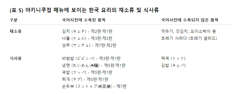 (표 5)에 나타난 **채소류(김치, 나물, 상추)**와 **식사류(비빔밥, 냉면, 국밥, 찌개, 순두부)**는, 일본의 대표적인 국어사전인 『고지엔(広辞苑)』과 『대사림(大辞林)』에도 등재되어 있는 고기 이외의 한국 요리 일품 메뉴들이다.