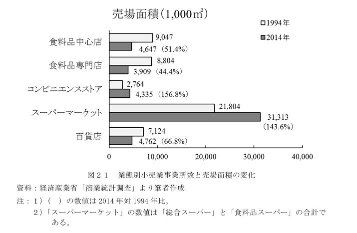 셀프 방식을 채택하는 대규모 소매점의 전개와 함께 비셀프 방식의 식료품 전문점과 중심점이 확실하게 줄어들었다. 표 20에 나타난 바와 같이 식료품 관련 소매업 점포수가 계속 감소하고 있으며, 2014년에는 20년 전인 1994년의 약 40%까지 급격히 감소했다. 한편, 매장면적은 대폭 증가하여 2004년에 정점을 찍었지만, 2014년에는 20년 전 수준을 유지하고 있다고 할 수 있다. 연간 판매액도 70%까지 감소했지만, 경기침체와 인구감소로 인한 식량시장의 절대적 축소가 영향을 미친 것으로 생각된다.
